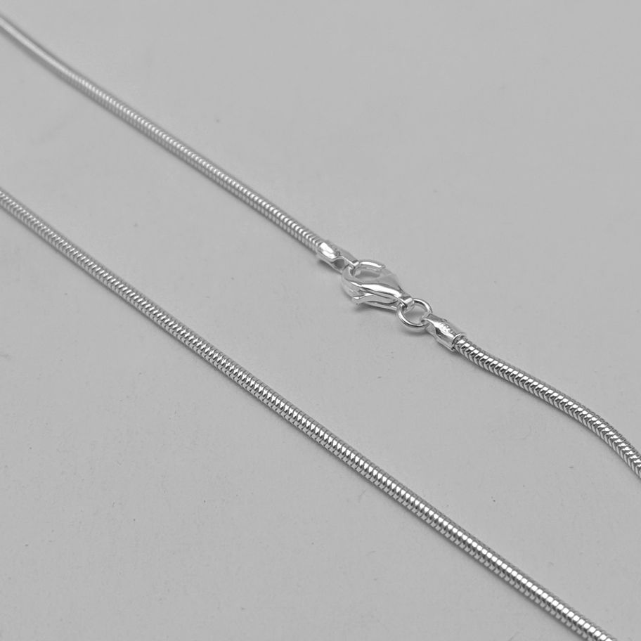 The 1.7mm Snake Chain is a refined and versatile piece, handcrafted from sterling silver with a smooth, continuous design. Its tightly woven links create a sleek, flexible structure that drapes beautifully around the neck, offering a subtle yet sophisticated shine. With a slightly bolder 1.7mm width, this chain is perfect for wearing alone as a statement of understated elegance or paired with a pendant for a personalized touch.