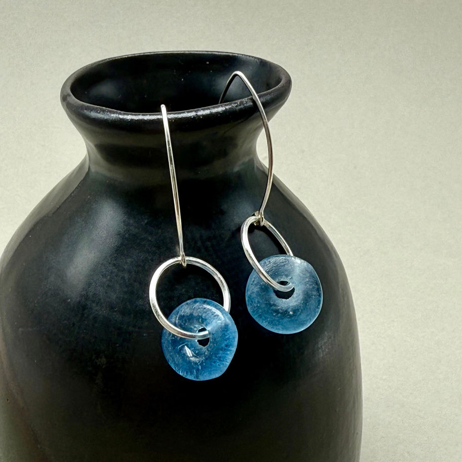 The African Glass Bead Earrings celebrate bold simplicity and heritage-inspired design. Suspended from elongated handmade silver ear wires, each earring features a single, translucent sky-blue glass bead with a softly textured, organic surface. The bead’s subtle irregularities and luminous finish highlight the artisanal nature of this piece, while the sleek silver hoops add a touch of modern refinement. Perfect for those who appreciate handmade silver jewellery with a story, these earrings are a striking example of personalized jewellery that bridges tradition and contemporary style.