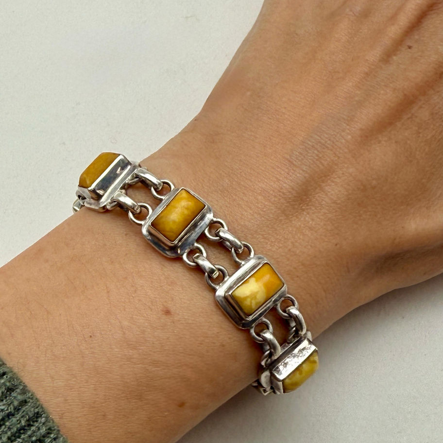 The Amber Bracelet is a radiant fusion of warmth and elegance, showcasing the timeless allure of natural amber set in handcrafted sterling silver. Each rectangular amber cabochon features a rich golden hue with subtle marbling, highlighting the organic beauty and unique character of the stone. Smooth bezel settings and articulated silver links provide both security and fluidity, while the adjustable clasp ensures a comfortable fit. This handmade silver jewellery piece is ideal for those who appreciate custom jewellery that captures earthy sophistication and artisan craftsmanship—an effortlessly graceful addition to any collection.