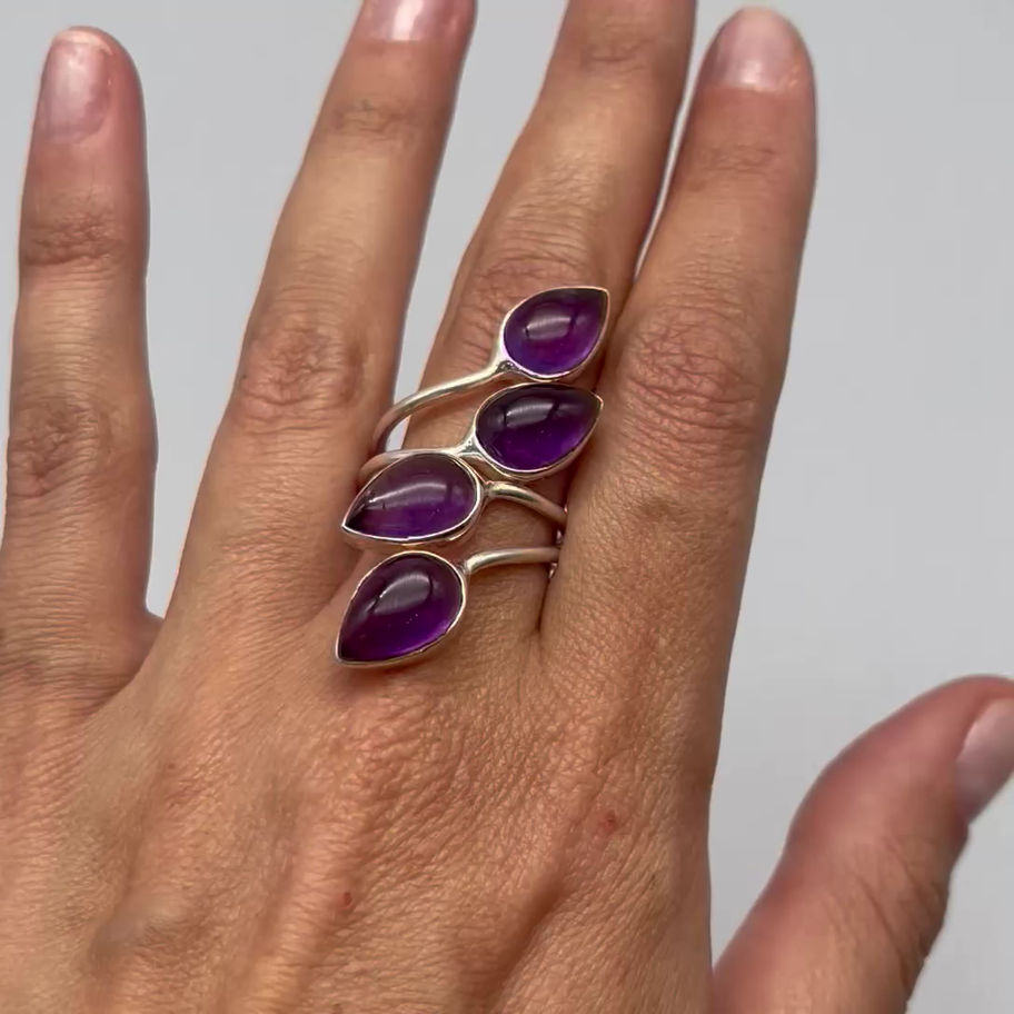 Four rich amethyst cabochons, hand-shaped and softly domed, rest in sterling silver cradles.