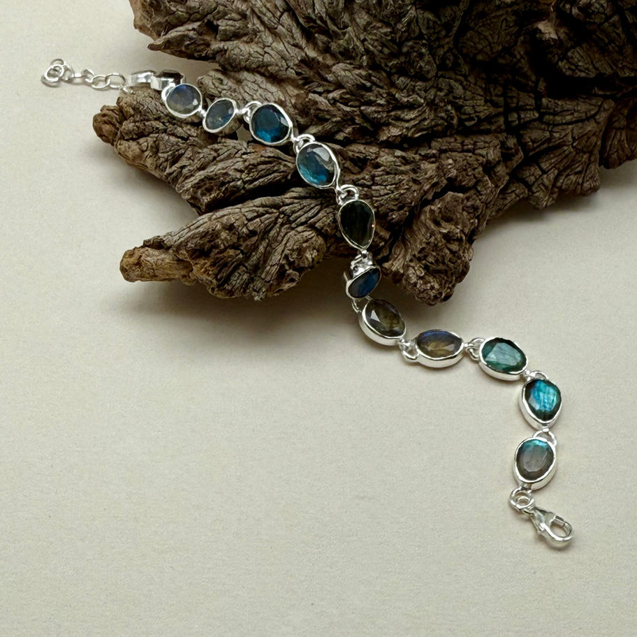 The Faceted Labradorite Irregular Pear Bracelet is a captivating fusion of organic form and iridescent allure. This handmade silver jewellery piece features a series of irregular pear-shaped labradorite gemstones, each faceted to reveal the stone’s signature flashes of blue, green, and gold. Bezel-set in sterling silver, the stones are linked in a fluid arrangement that follows the natural contours of the wrist, offering a comfortable and elegant fit. Celebrated for its mystical sheen and protective qualities, labradorite makes this bracelet an enchanting addition to any personalized jewellery collection.