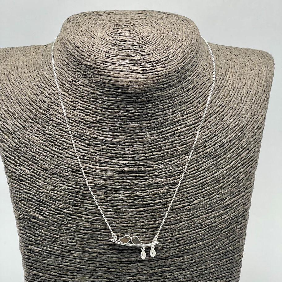 The "Kissing Birds Necklace" is a beautifully sentimental piece of handmade silver jewellery, perfect for symbolizing love and togetherness. This charming necklace features two delicate bird figures perched closely on a slender branch, with their heads tilted towards each other, creating the impression of a tender kiss. The birds are crafted with from polished silver s, adding a soft, romantic touch to the design.