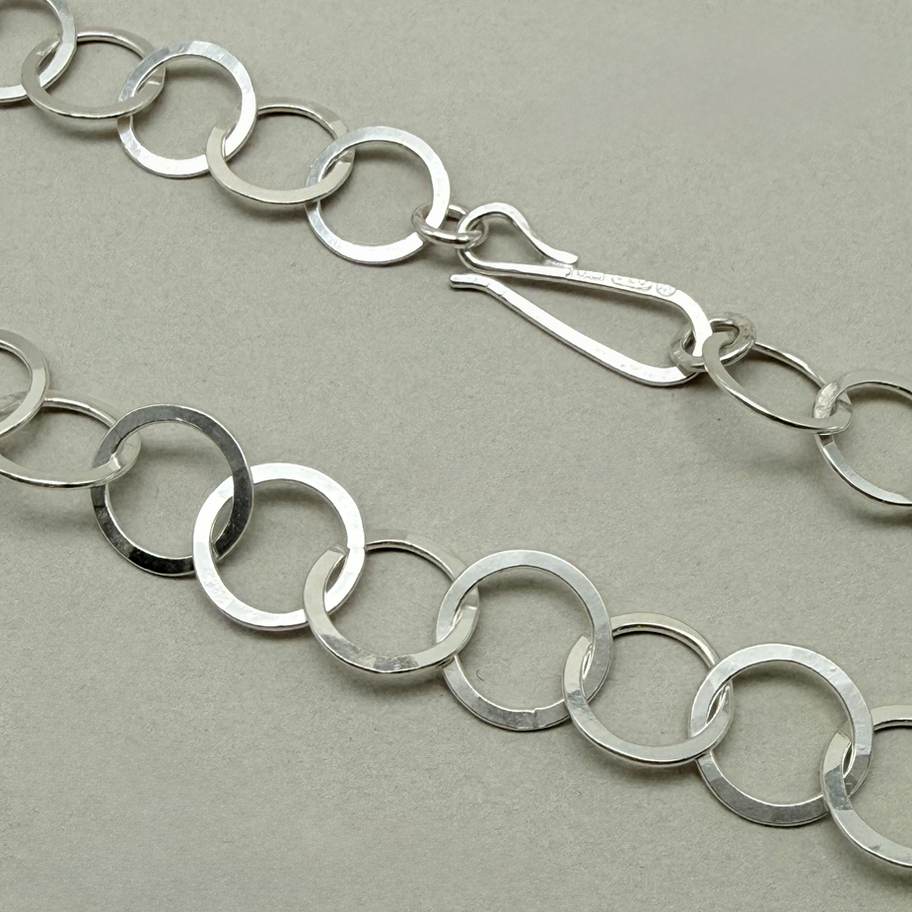 The Long Round Link Necklace is a timeless piece that combines simplicity with elegance. Handcrafted from sterling silver, this necklace features a series of interlocking round links, creating a flowing, dynamic design that drapes beautifully. The alternating polished and textured links add subtle depth and dimension, enhancing the necklace's versatility and charm. Its long length makes it perfect for layering or wearing alone as a statement piece.