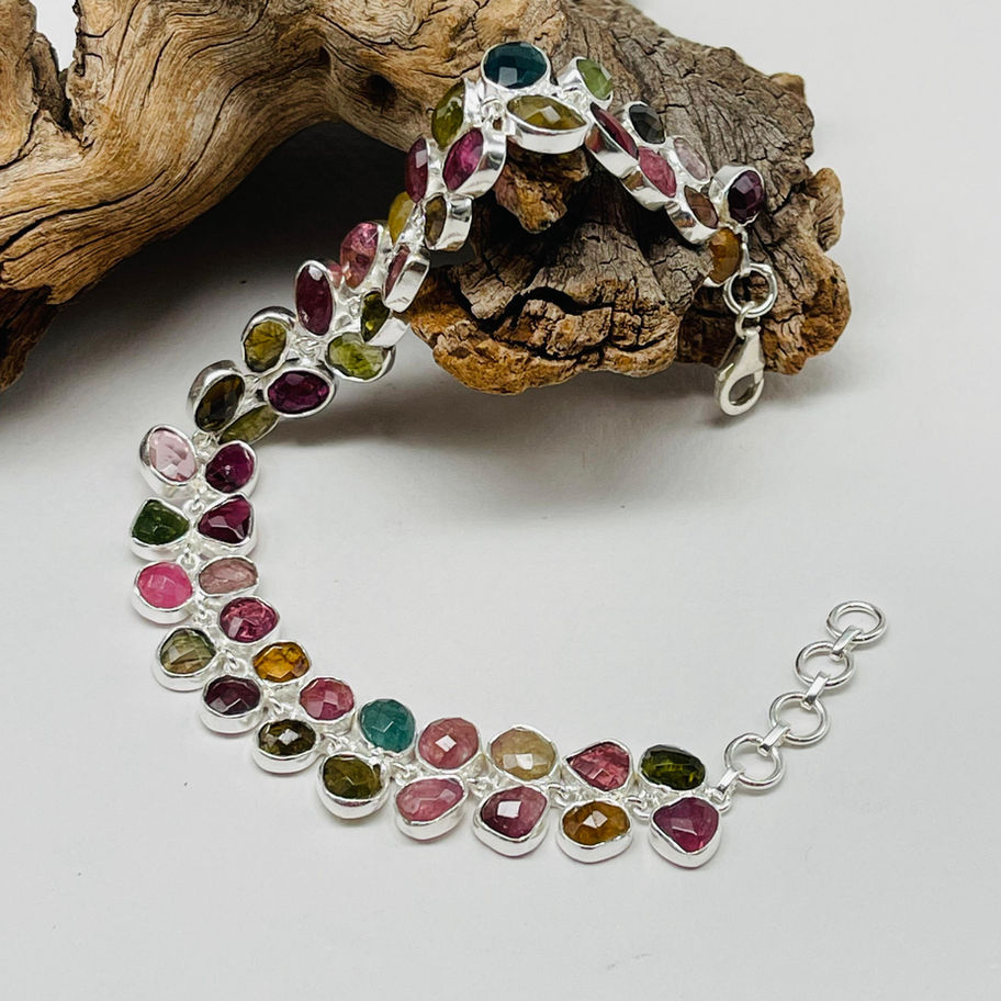 This Mixed Colour Faceted Tourmaline Bracelet is a vibrant celebration of natural beauty, featuring an array of tourmaline gemstones in a captivating spectrum of colors—from deep greens and rich pinks to warm browns and soft yellows. Each tourmaline stone is faceted to catch the light, enhancing its unique hue and creating a beautiful play of sparkle along the wrist. Set in polished silver bezels and linked together, the stones form a flexible and comfortable bracelet that closes with an adjustable clasp, ensuring a perfect fit.
