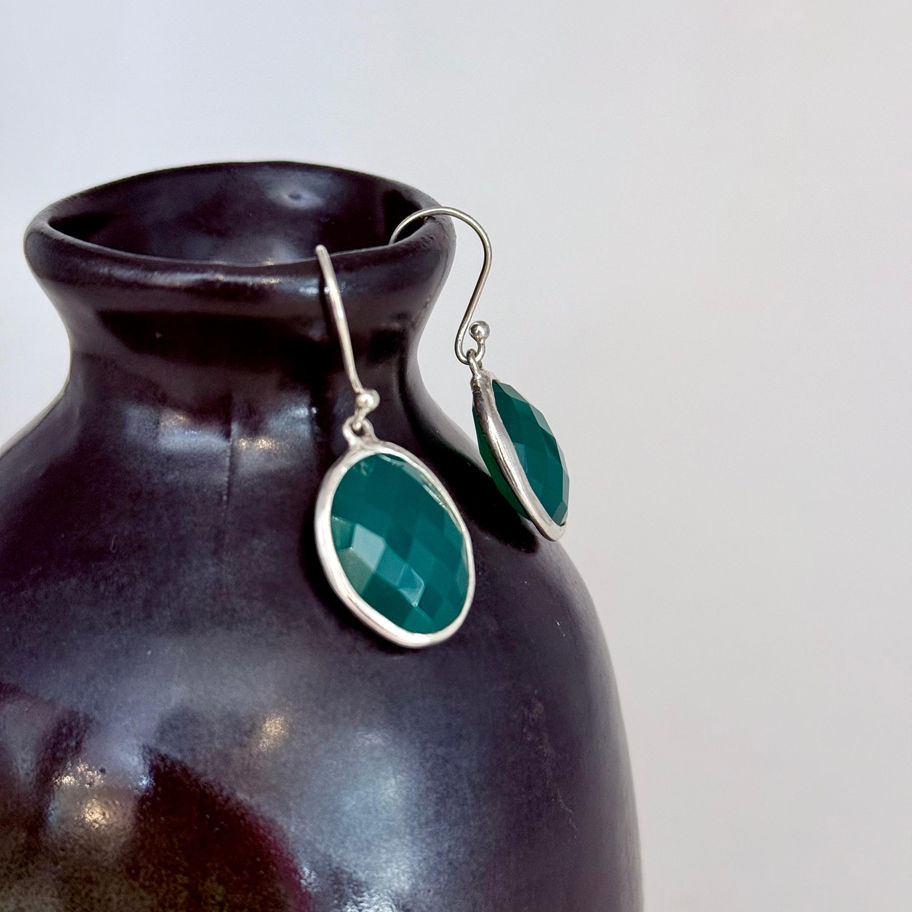 The Oval Green Onyx Hammered Bezel Earrings are a striking blend of elegance and artisanal craftsmanship. Each earring features a faceted oval green onyx gemstone, set in a handcrafted sterling silver bezel with a subtly hammered texture. The rich green hues of the onyx shimmer beautifully as they catch the light, creating a sophisticated yet organic feel. Suspended from delicate silver hooks, these earrings offer both movement and timeless charm. Perfect for those who appreciate refined yet unique jewellery, this artisan silver piece adds a touch of natural beauty to any collection.