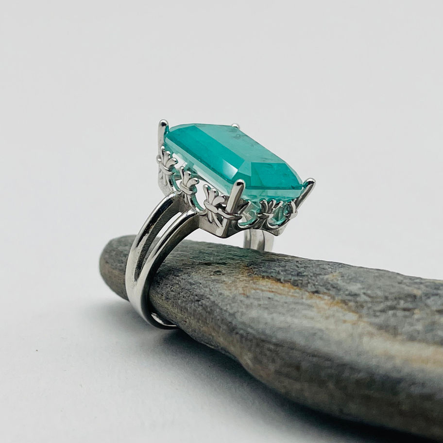 The Pareba Tourmaline Slice Ring is a stunning statement piece that highlights the vibrant, oceanic hues of the rare Paraiba tourmaline. Set in a sleek silver band, the rectangular slice of tourmaline reveals the gemstone’s natural beauty with its striking turquoise color and raw texture. The minimalistic prong setting allows the stone to take center stage, while the handcrafted silver enhances its vivid brilliance. This ring is a perfect blend of boldness and elegance, ideal for those who appreciate unique, artisanal silver jewellery with an eye-catching pop of color.