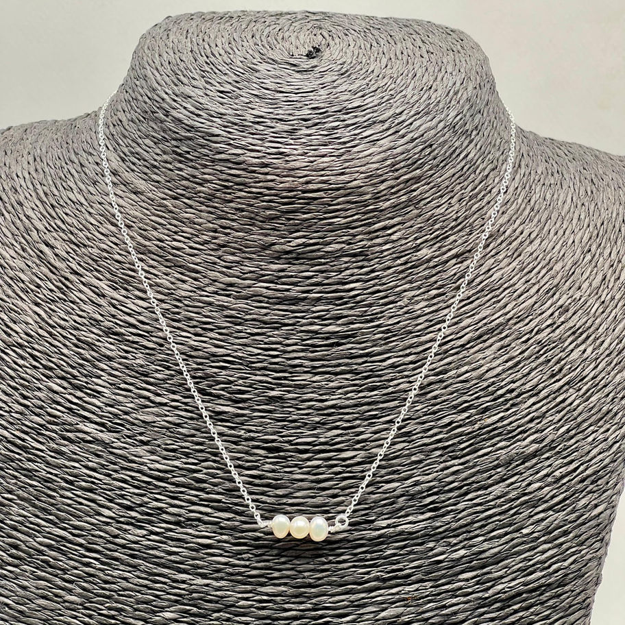 The Pearl Trio Necklace is a timeless piece of handmade silver jewellery, exuding elegance and simplicity. Featuring three lustrous freshwater pearls, arranged in perfect harmony, the design highlights their natural iridescence and classic beauty. The pearls are strung delicately on a fine silver chain, creating a minimalist yet sophisticated look that complements any outfit.