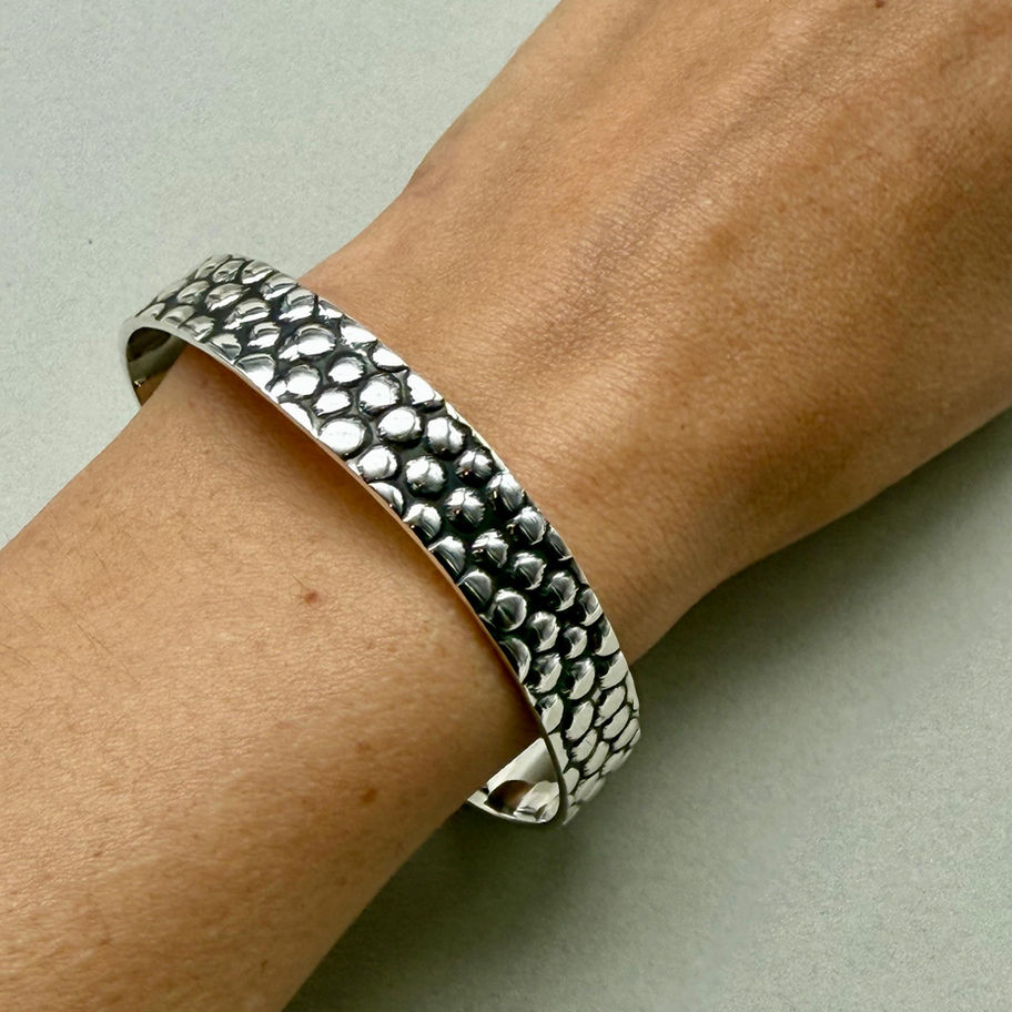 The Pebble Cuff is a bold and contemporary piece of handmade silver jewellery, distinguished by its richly textured surface reminiscent of river-worn stones. Crafted from solid silver, this artisan cuff features a high-polish finish that enhances its tactile, pebble-like pattern, adding depth and visual intrigue. The broad, slightly curved form hugs the wrist comfortably while making a confident statement, blending organic inspiration with sculptural elegance. Ideal for collectors of custom jewellery or those seeking one-of-a-kind artisan silver pieces, the Pebble Cuff is a timeless design with modern appeal.