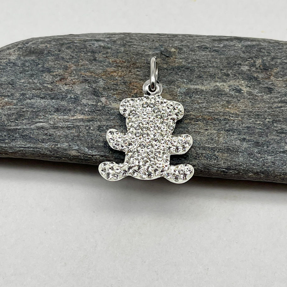 This reversible teddy bear charm is a delightful piece of handmade silver jewellery that combines playfulness with elegance. Crafted from high-quality sterling silver, the front side features a smooth, polished teddy bear design with intricate detailing that brings the adorable figure to life. On the reverse side, the charm sparkles with a pave of shimmering cubic zirconia stones, adding a touch of glamour and versatility.