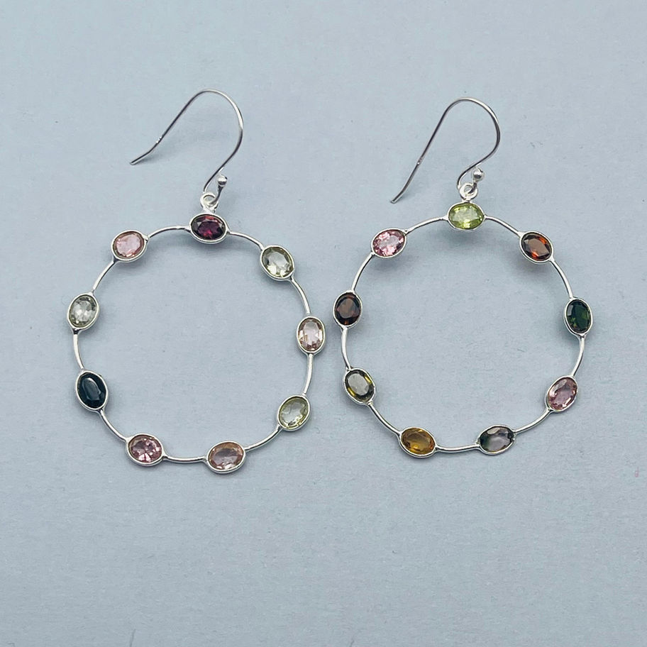 The Tourmaline Round Hoop Earrings present a symphony of color and craftsmanship, a standout piece in Lali's collection of handmade silver jewellery. Each hoop is meticulously adorned with a spectrum of tourmaline gemstones, known for their wide array of colors that symbolize the diversity of the natural world. Set within a lustrous silver frame, these stones range from deep forest greens to blush pinks and golden yellows, providing a versatile palette that complements any ensemble.