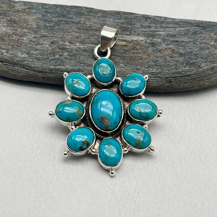 The Turquoise Flower Pendant is a stunning piece of handmade silver jewellery, inspired by the natural beauty of a blossoming flower. Featuring a central oval turquoise stone surrounded by eight smaller oval turquoise cabochons, the pendant radiates vibrant blue-green hues with natural veining that adds character and uniqueness. Set in polished sterling silver, the design emphasizes the symmetry and organic charm of the gemstones, with intricate silverwork adding a touch of elegance.